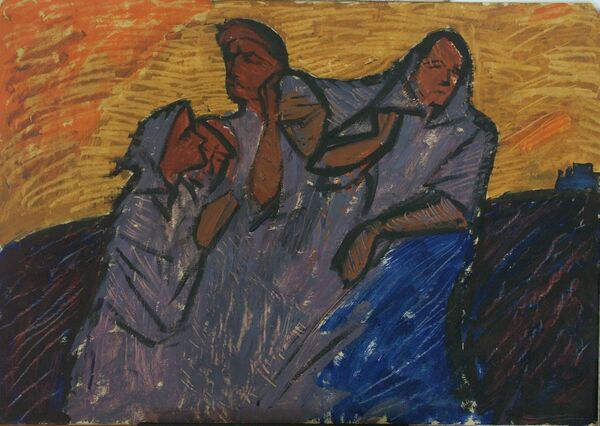 На полотне изображён пейзаж с чёрным вспаханным полем, на котором справа отчётливо читается силуэт трактора. В центре композиции сгруппированы три женские фигуры, стоящие плотно друг к другу в переднем плане, а немного позади слева — две мужские фигуры. Пози, жесты и мимика персонажей передают драматизм сцены и подчёркивают эмоциональное напряжение. Все фигуры обведены чёрным контуром, что усиливает их визуальную выразительность на однотонном фоне. На обороте картины, справа от центра, синим и красным карандашом нанесены цифры «157-а».