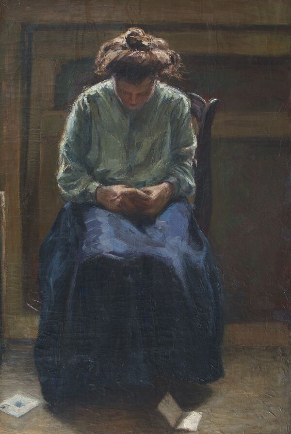 На полотне изображена в фас женщина, сидящая на стуле с опущенной головой и сложенными на уровне пояса руками. Она одета в зеленовато-серую кофту и темно-голубую юбку. На полу перед ней лежит сложенное пополам письмо, а слева — конверт. Фон выполнен в коричневато-серых тонах с переходом к темно-зеленоватому, что придаёт работе сдержанную цветовую гамму. Волосы, плечи и руки фигуры выделены контурным светом сверху, подчёркивающим детали композиции портрета.