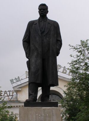 | Есть предположение, что это один из вариантов памятника Горькому в Москве, созданный под руководством знаменитой Веры Мухиной. Установлен 6 сентября 1960 года около кинотеатра, носящего имя пролетарского литератора и открытого двумя годами раньше. Скульптура выполнена из гранита и поставлена на четырёхгранный постамент — столб с фигурным цоколем и широкой пирамидальной базой. Писатель изображён в полный рост. Высота фигуры — 3,5 м, а всего памятника — 7 м. Монумент исполнен в стиле сталинского ампира. | |
