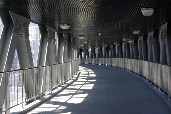 Мост включает в себя пешеходный переход дугообразной формы, опирающийся на две промежуточные опоры, и две крайние опоры-башни, совмещенные с конструкциями лестничных сходов[5].