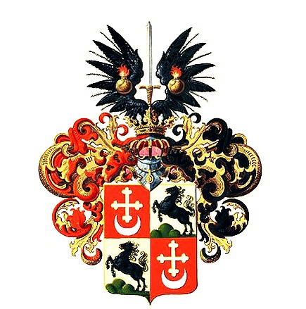 Щит разделен на четыре части. В первой и четвертой червленых частях золотой трилистный крест над серебряным полумесяцем вверх. Во второй и третьей золотых частях скачущий вправо через три зеленых холма черный конь с червлеными глазами и языком. Щит увенчан дворянским коронованным шлемом. Нашлемник: два черных орлиных крыла, на каждом по золотой горящей гранате. Между крыльями вертикально серебряный с золотой рукояткой меч острием вверх. Намет: справа червленый с золотом, слева черный с золотом[2].