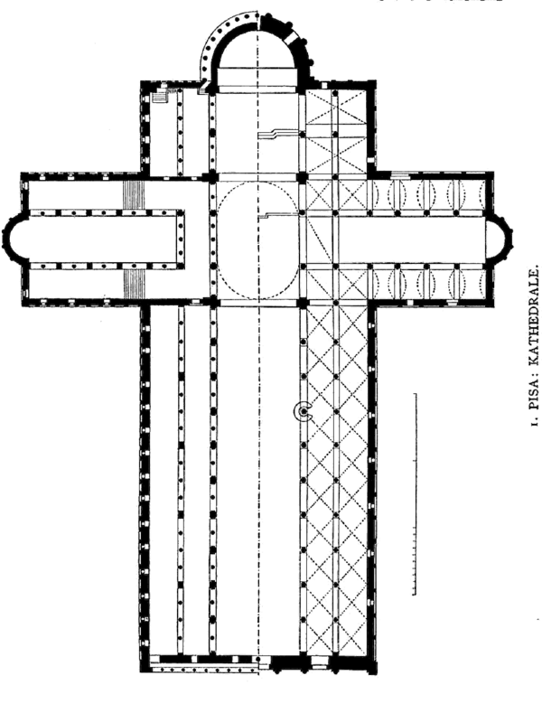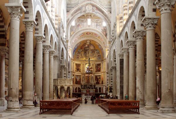 Здание изначально было построено в виде греческого креста (с равными перекладинами) в плане, в пересечении перекладин которого сооружён купол. В настоящее время пятинефный собор с трёхнефным трансептом в плане имеет вид латинского креста. Такой своеобразный план здания имеет сходство с планом древнехристианской базилики Калат-Симан, расположенной в Сирии.[2] Внутри возникает эффект огромного пространства, аналогичный большим мечетям и достигаемый за счёт арок и чередования белого и чёрного мрамора. Две колоннады из чёрного гранита в нефах являются явным свидетельством византийского влияния. Сами колонны происходят из мечети Палермо, завоёванной пизанцами в 1063 году.