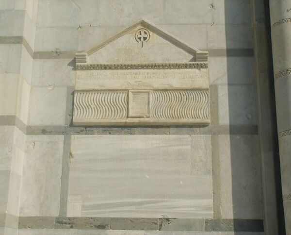 Три первоначальные двери главного фасада погибли в пожаре 1595 года. Существующие двери были выполнены в 1602 в мастерской Джамболоньи. Слева от северной двери в стене главного фасада находится гробница первого архитектора собора Бускето ди Джованни Джудиче (ок. 1110; см. выше) с большой латинской эпитафией, сравнивающей его с Дедалом (см. фото).
