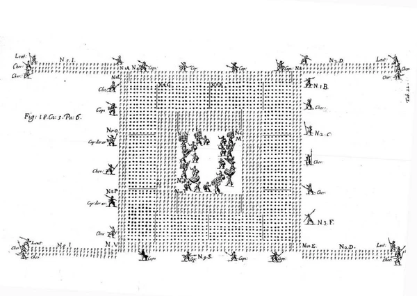 Массовое появление ручного огнестрельного оружия наиболее сильно повлияло на видоизменение боевого порядка пикинёров. В период введения этого оружия боевой порядок пикинёров состоял из их громоздких батальонов, подобных фаланге, строившихся рядом. Пикинёрные батальоны долгое время продолжали оставаться остовом войскового боевого порядка и окружались лишь мушкетерами, строившимися в пять шеренг кругом пикинёрных батальонов[5].