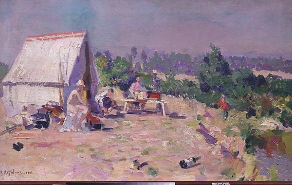 На полотне представлен летний пейзаж с элементами бытовой сцены. У правого края изображена речка, на втором плане слева расположен шалаш, возле которого находятся двое мужчин: один сидит, другой присел на корточки. Перед палаткой сидит обнажённый мужчина, что подчёркивает непринуждённость обстановки. Справа от палатки стоит стол, за которым находится ещё один человек. Ближе к воде изображён ребёнок. На третьем плане видны зелёные кусты, а на первом плане справа лежит бутылка, что дополняет атмосферу отдыха на природе.