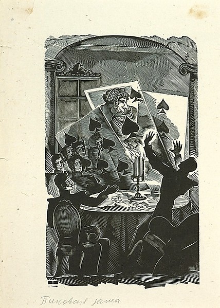 До разговора с графиней Германн сам шёл навстречу чёрной силе. Когда же графиня умерла, он подумал, что замысел его рушится, что всё кончено и жизнь отныне пойдёт по-старому, с тем же капитальцем и нетронутыми процентами. Но тут роли переместились: из нападающего он превратился в объект нападения. Мёртвая старуха явилась к нему. «Я пришла к тебе против своей воли, — сказала она твёрдым голосом, — но мне велено исполнить твою просьбу» и т. д. Однако те, по чьей воле она пришла исполнить волю Германна, насмеялись над ним: не то назвали ему две верных карты и одну, последнюю, самую важную — неверную, не то в последний, решительный миг подтолкнули его руку и заставили проиграть всё. Как бы то ни было, возвели почти на предельную высоту — и столкнули вниз. И в конце концов — судьба Германна буквально та же, что и судьба Павла с Евгением: он сходит с ума[11].