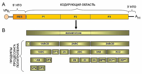- 3B — это VPg, белок прикрепляющийся к 5'-концу вирусной РНК.