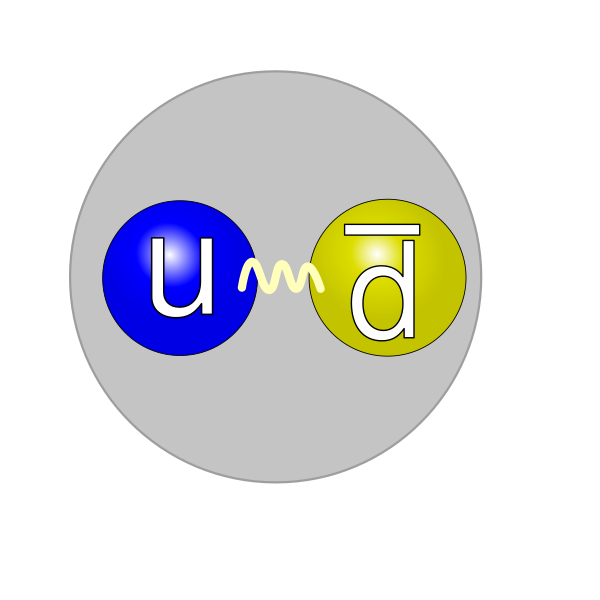 - Электрически нейтральные комбинации (u + анти-u) и (d + анти-d) могут существовать только в виде их суперпозиции , так как несут одинаковый набор квантовых чисел. Низшее энергетическое состояние подобной суперпозиции — π0-мезон, являющийся античастицей для себя самого (истинно нейтральная частица, подобно фотону). Нейтральный пион, состоящий из кварка и соответствующего ему антикварка (точнее, из суперпозиции таких состояний), представляет собой один из видов ониев (связанных состояний частицы и античастицы). Его можно было бы назвать кварконием, однако обычно этот термин относят к системам из тяжёлых кварков.