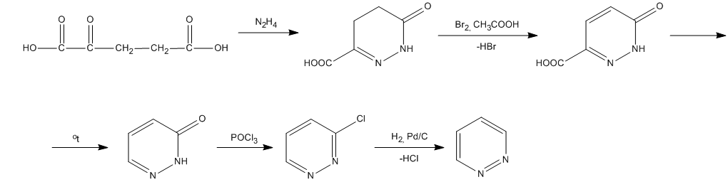 Пиридазин синтезируют реакцией гидразина с a-кетоглутаровой кислотой по следующей схеме: