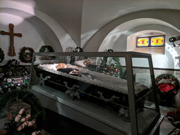 Официально гробница Пирогова именуется как «церковь-некрополь». Тело Пирогова находится несколько ниже уровня земли в крипте — цокольном этаже православного храма, в застеклённом саркофаге, к которому открыт доступ всем желающим отдать дань уважения памяти великого учёного[27].