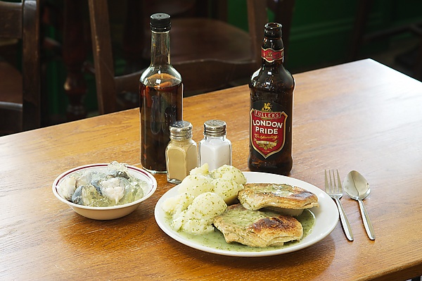 Во многих заведениях, в которых продают пироги и пюре, в качестве гарнира подают горячего, тушёного или холодного заливного угря. Чаще всего блюдо приправляют солодовым уксусом и уксусом с перцем чили[4][7].