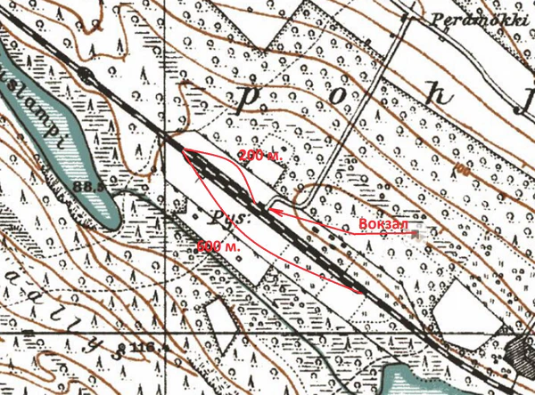 Финская станция Pirttipohja имела два боковых пути, точно такие же как и соседняя станция Alalampi: южный боковой путь имел полезную длину в 600 метров и был способен обеспечить полноценный разъезд как пассажирских, так и грузовых поездов. Северный боковой путь шёл от нечётной (западной) горловины до оси станции[9]. Его главное назначение было погрузка леса[10]. Здание вокзала было построено в 1921 году и расширено в 1934 году. Второе здание вокзала было построено в 1943 году заместо сгоревшего[11].