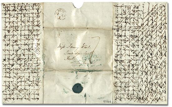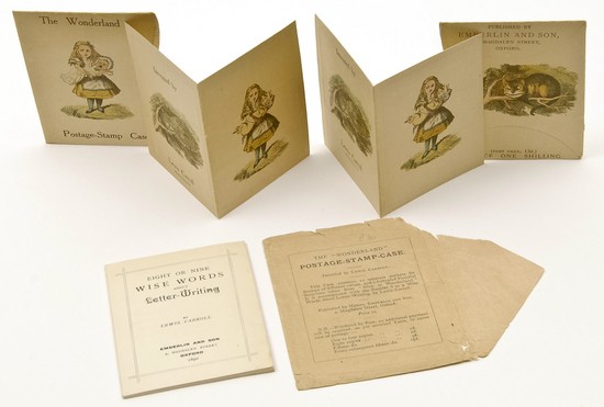 Первое издание памфлета Льюиса Кэрролла «Восемь или девять мудрых слов о том, как писать письма», в котором он выступал против практики писать послания поперёк написанного (памфлет показан в комплекте с изобретённым Кэрроллом держателем для почтовых марок)
