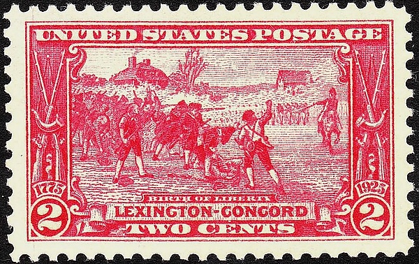 В 1925 году отмечалось 150-летие сражения, и были выпущены три почтовые марки стоимостью 1, 2 и 3 цента. Эти марки стали первыми марками, посвящёнными событиям войны за независимость. 2-центовая марка «Birth of Liberty» была основана на картине Генри Сэндхама «The Dawn of Liberty» 1885 года. Она изображает идеализированную версию перестрелки в Лексингтоне, на которой майор Питкерн и капитан Паркер приказывают открыть огонь[6].