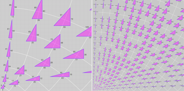 - Множество всех примитивных пифагоровых треугольников образует корневое тернарное дерево естественным способом, см. Дерево примитивных пифагоровых троек.