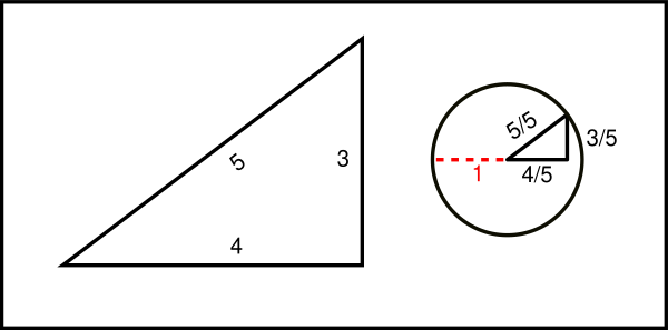 можно понять в терминах геометрии рациональных точек на единичной окружности [28]. Пусть имеется треугольник с катетами a и b и гипотенузой c, где a, b и c — положительные целые. По теореме Пифагора a2 + b2 = c2, а после деления обеих сторон на c2