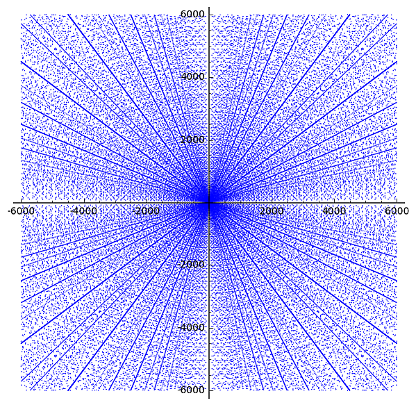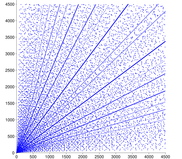 Не все тройки с примитивны, например, (6, 8, 10) получается умножением на два тройки (3, 4, 5). Каждая из троек с небольшой гипотенузой образует хорошо различимую радиальную прямую из кратных ей троек на диаграмме рассеяния.