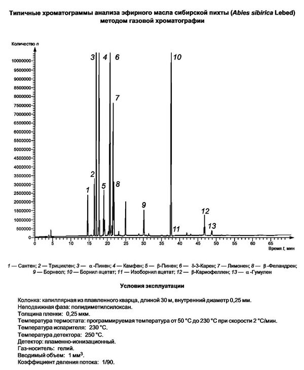Наиболее ценная часть пихтового масла — борнилацетат (уксуснокислый эфир борнеола), его содержание у различных видов пихт колеблется от 8 до 47%. Борнилацетат — это твердое кристаллическое вещество, растворяющееся в других частях эфирного масла. При низкой температуре он иногда может выпадать на дно сосуда в виде белых кристаллов. Из всех составных частей эфирного масла борнилацетат имеет наибольший удельный вес, и от его количества зависит удельный вес масла.