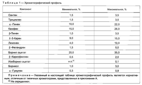 Проводят испытания эфирного масла методом газовой хроматографии. Определяют в полученной хроматограмме полученные репрезентативные и характерные компоненты, представленные в таблице 1. Соотношение этих компонентов, определённое интегратором, должно быть таким как показано в таблице 1. Они представляют собой хроматографический профиль эфирного масла.