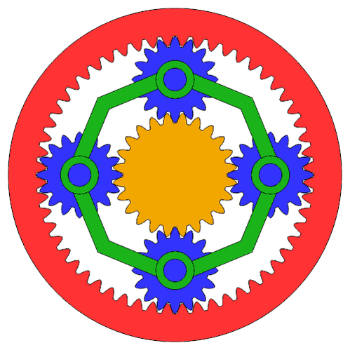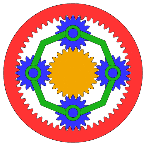 Далее вращение планетарных шестерён может передаваться кольцевой шестерне, с соответствующим передаточным числом. Если кольцевая шестерня имеет зубьев, то она будет вращаться с соотношением относительно планетарных шестерён. (В данном случае перед дробью нет минуса, так как при внутреннем зацеплении шестерни вращаются в одну сторону). Например, если на кольцевой шестерне 64 зуба, то относительно приведённого выше примера это отношение будет равно , или . Таким образом, объединив оба примера, мы получим следующее: