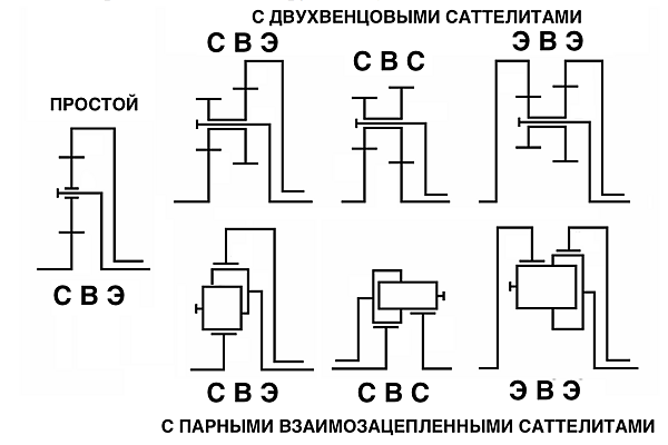 Критерием деления ПМ на простые и сложные является число составляющих его основных звеньев (именно основных, а число сателлитов — не в счёт). Простой ПМ имеет всего три основных звена: одно водило и два любых центральных зубчатых колеса. Кинематика допускает всего-лишь 7 (семь!) ПМ, подпадающих под это условие: один наиболее распространённый и всем известный, так называемый «элементарный», с набором одновенцовых сателлитов схемы СВЭ; три ПМ с двухвенцовыми саттелитами (СВЭ, СВС, ЭВЭ) и три ПМ с парными взаимозацепленными сателлитами (СВЭ, СВС, ЭВЭ)).