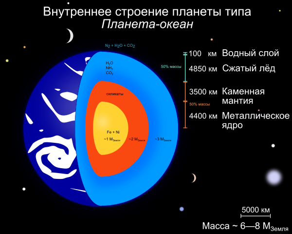 В процессе миграции из-за мощных турбулентных возмущений, которые могут возникать в протопланетарном газопылевом диске, вследствие чего орбита планеты может измениться[4], такая ледяная планета массой в 6—8[1] земных масс может оказаться достаточно близко к своей звезде для того, чтобы внешняя ледяная кора планеты расплавилась и планета оказалась полностью покрытой океаном жидкой воды глубиной в 72—133 км[1]. Давление на дне такого океана, составляющее порядка 1—2 ГПа[1] (10—20 тыс. атм.), является достаточным для формирования полиморфных модификаций льда, которые тяжелее жидкой воды и при таком давлении никогда не будут таять. Ниже будет располагаться твёрдая кора изо льда различных модификаций толщиной около 4850 км[5], и, наконец, твёрдое ядро радиусом около 7900 км, состоящее из каменной мантии толщиной 3500 км[5] и металлического ядра радиусом в 4400 км[5].