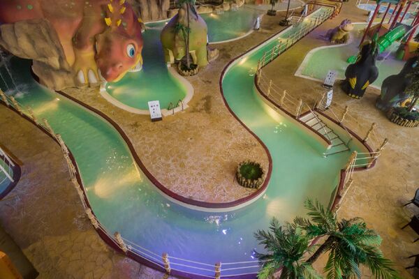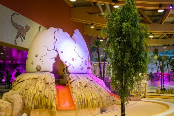 Интерьер аквапарка «Планета» выполнен в тематике юрского периода. Посетители попадают в мир, существовавший миллионы лет назад, когда на Земле жили только динозавры. Некоторые горки «спрятаны» в гигантских динозавровых яйцах, на искусственных стенах пещер можно увидеть окаменелости вымерших ящеров, а фигуры динозавров встречают детей у горок в детской зоне. Также здесь есть тропические озёра и растительность вокруг них. Атмосферу дополняют водопады, лагуны, медленно текущая по периметру акватории «ленивая река», пещеры и кафе, оформленные в стиле жилищ древних цивилизаций[1][2].