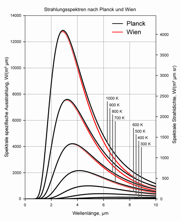 К тому моменту, когда Планк приступил к работе над теорией теплового излучения, перед этой дисциплиной стояла проблема фундаментальной важности — рассчитать распределение энергии в спектре равновесного излучения абсолютно чёрного тела, то есть тела, полностью поглощающего падающее на него излучение во всём спектральном диапазоне. Хорошей практической реализацией абсолютно чёрного тела является небольшое отверстие в стенке замкнутой полости; внутри такого устройства устанавливается равновесие между излучением и веществом, так что излучение, выходящее из отверстия, близко по своим характеристикам к излучению чёрного тела. Важность функции , описывающей испускательную способность абсолютно чёрного тела при данной температуре и на данной частоте , определяется законом Кирхгофа (1859), согласно которому отношение испускательной и поглощательной способностей любого тела равно как раз универсальной функции . К концу XIX века было установлено несколько закономерностей, касающихся равновесного излучения абсолютно чёрного тела. Так, закон Стефана — Больцмана (1879, 1884) утверждает температурную зависимость объёмной плотности энергии излучения, величины, интегральной по всем частотам в спектре. Закон смещения Вина (1893) позволил свести задачу поиска функции двух аргументов к нахождению функции одной переменной . Кроме того, этот закон определяет смещение максимума спектра излучения при изменении температуры. Попытки вывести зависимость из термодинамических и электродинамических соображений предпринимались такими физиками, как Владимир Михельсон (1887) и Вильгельм Вин (1896); последнему удалось получить закон нормального распределения излучения в спектре чёрного тела, получивший приблизительное подтверждение в измерениях Фридриха Пашена, Отто Люммера и Эрнста Прингсгейма[90][91]. С практической точки зрения эти исследования были обусловлены необходимостью поиска новых источников света и, в частности, создания стандартов для оценки электрических ламп накаливания[92][93].