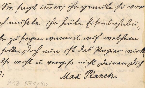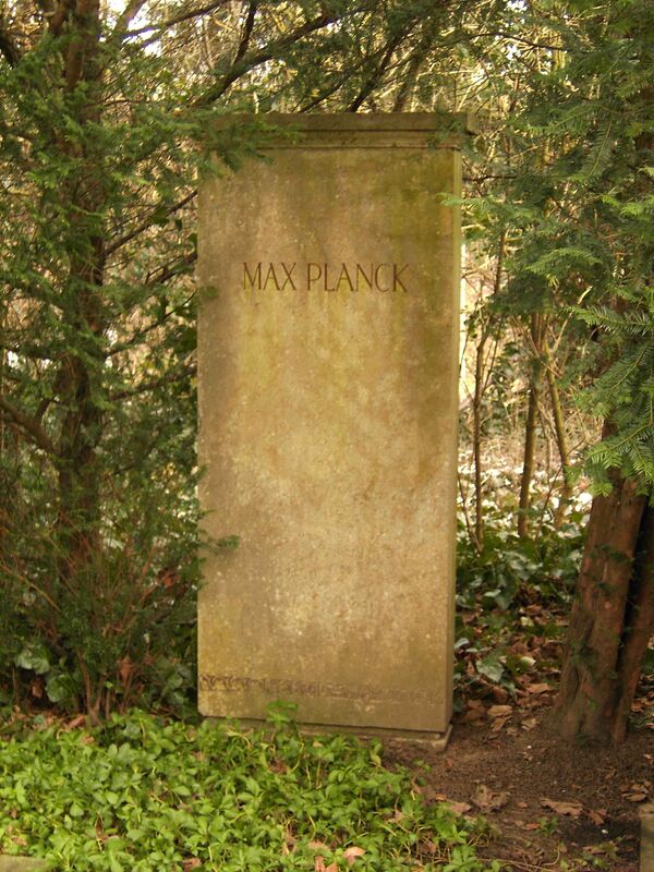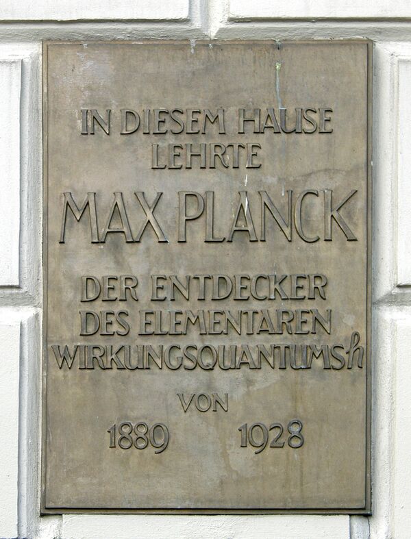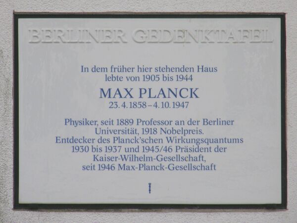 К берлинскому периоду относится высшее научное достижение Планка. В середине 1890-х годов он занялся проблемой теплового излучения и в конце 1900 года достиг решающего успеха: получил правильную формулу для распределения энергии в спектре абсолютно чёрного тела и дал её теоретическое обоснование, введя знаменитый «квант действия» . Квантовая гипотеза немецкого учёного, глубокий смысл которой вскрылся лишь много позже, ознаменовала рождение квантовой физики[31]. В последующие годы Планк приложил много усилий, пытаясь согласовать свои результаты с классической физикой; он крайне настороженно относился к дальнейшим шагам, уводящим в сторону от старых представлений, например к теории световых квантов Эйнштейна[32]. Однако все его усилия оказались напрасными, о чём он писал в своей «Научной автобиографии»: