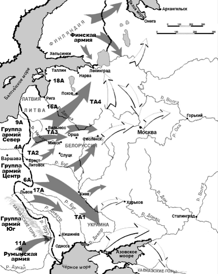 Германское руководство исходило из необходимости обеспечить разгром советских войск на всём протяжении линии фронта. В результате задуманного грандиозного «пограничного сражения» у СССР не должно было оставаться ничего, кроме 30-40 резервных дивизий. Этой цели предполагалось достичь наступлением по всему фронту. Основными оперативными линиями были признаны московское и киевское направления. Их обеспечивали группы армий «Центр» (на фронте 500 км сосредотачивалось 48 дивизий) и «Юг» (на фронте 1250 км сосредотачивалось 40 немецких дивизий и значительные силы союзников). Группа армий «Север» (29 дивизий на фронте 290 км) имела задачу обеспечивать северный фланг группы «Центр», захватить Прибалтику и установить контакт с финскими войсками. Общее число дивизий первого стратегического эшелона, с учётом финских, венгерских и румынских войск, составляло 157 дивизий, из них 17 танковых и 13 моторизованных, и 18 бригад[18].