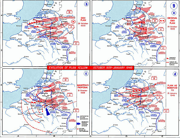 Повторение шлиффеновского замысла начала столетия, наступление на Францию серповидным движением через Бельгию, не устраивал его. В 1939 году было очевиднее, чем в 1914, что если и случатся боевые действия между Германией и союзниками, то именно в Бельгии, так как линия Мажино вдоль франко-немецкой границы надёжно защищала Францию. По сравнению с линией Мажино бельгийские укрепления были очень слабыми. Очевидно, что французы также понимали это и ожидали такого развития событий. Однако, хоть Гитлер и имел другую точку зрения, он желал как можно быстрого начала наступательной операции:
