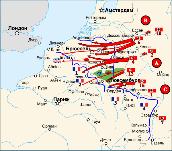 - a) auf der nördlichen Flanke des westlichen Front bereiten Offensive teritorrii durch Luxemburg, Belgien und Holland. Die Offensive sollte so viel Kräfte wie möglich und so schnell wie möglich;