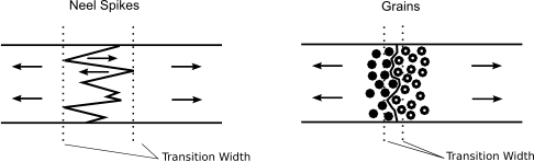 Это вызывает проблемы, так как пики взаимно компенсируют магнитное поле друг друга, и на границах областей переход от одной намагниченности к другой происходит на длине пиков Нэля. Этот параметр называется шириной перехода.