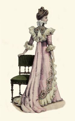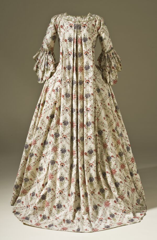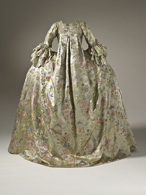 Особенностью платья является ткань на спине, уложенная в бантовую складку, спадающая с плеч до пола наподобие шлейфа. В наиболее популярной форме платье не застёгивается спереди, открывая декоративный стомак и подъюбник. Рукава платья достигают локтя, и часто украшены оборками. Нередко их дополняли отдельными съёмными оборками из кружева — ангажантами.