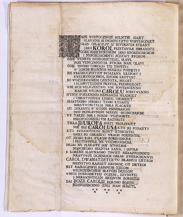 Речь была написана по-русски, но отпечатана латинскими буквами, так как в распоряжении Спарвенфельда не имелось литер кириллицы[3]. Речь была напечатана на восьми листах, из которых один лист был титульным, сама речь располагалась на шести листах, а на оставшемся листе — стихотворение в жанре элегии-плача[1]. Речь была напечатана без имени автора. Но в тексте есть акроним имени автора: в последней строке речи первые буквы четырёх слов (J, G, S и P, которые являются инициалами имени Johan Gabriel Sparfwenfeldt) выделены размером. По имеющимся данным, текст речи был отпечатан всего в двух экземплярах[1]. Сохранился один из них, и он находится в библиотеке Уппсальского университета. Одна из фотокопий страниц этого издания в настоящее время хранится в Российской национальной библиотеке в Санкт-Петербурге[4]. Высказываются различные предположения о том, почему речь была отпечатана. По одной версии, она предназначалась для распространения среди русскоязычного населения, которое по каким-то причинам не последовало. По другой версии, речь была отпечатана только для документации в связи с торжественным мероприятием[3].