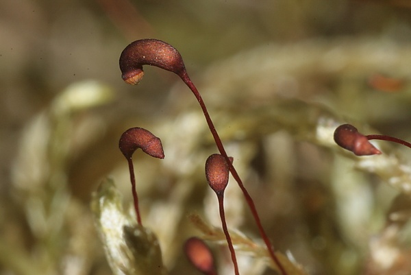 Коробочка наклонённая до горизонтальной, продолговато-яйцевидной формы, с конической крышечкой, часто изогнутая. Ножка красная. Перистом двойной.