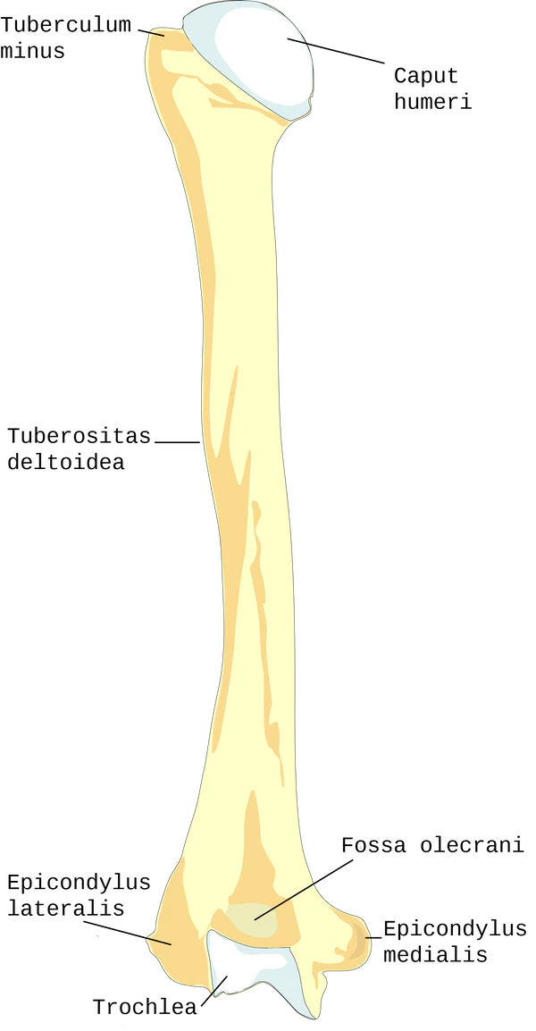 К плечевой кости крепятся некоторые мышцы пояса верхней конечности, плеча и предплечья[5].