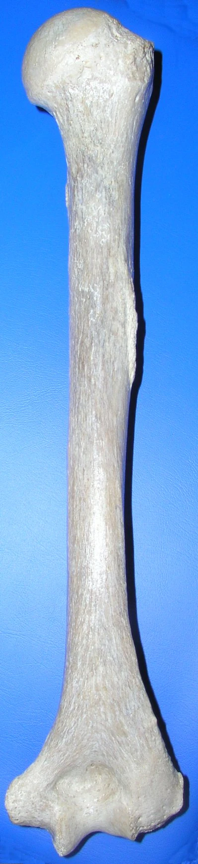 На дистальном эпифизе расположен мыщелок (лат. condylus humeri) и по бокам от него два надмыщелка — медиальный и латеральный (лат. epicondylus medialis et lateralis). Между надмыщелками располагается поверхность для сочленения с костями предплечья, разделённая на блок плечевой кости (лат. trochlea humeri) и головку мыщелка плечевой кости (лат. capitulum humeri). Выше них на передней стороне соответственно располагаются венечная (лат. fossa coronoidea) и лучевая (лат. fossa radialis) ямки, а также сзади локтевая ямка (ямка олекранона, лат. fossa olecrani), которые необходимы для сочленения с локтевой и лучевой костями, образуя локтевой сустав. На задней стороне медиального надмыщелка проходит борозда локтевого нерва (лат. sulcus nervi ulnaris)[4].