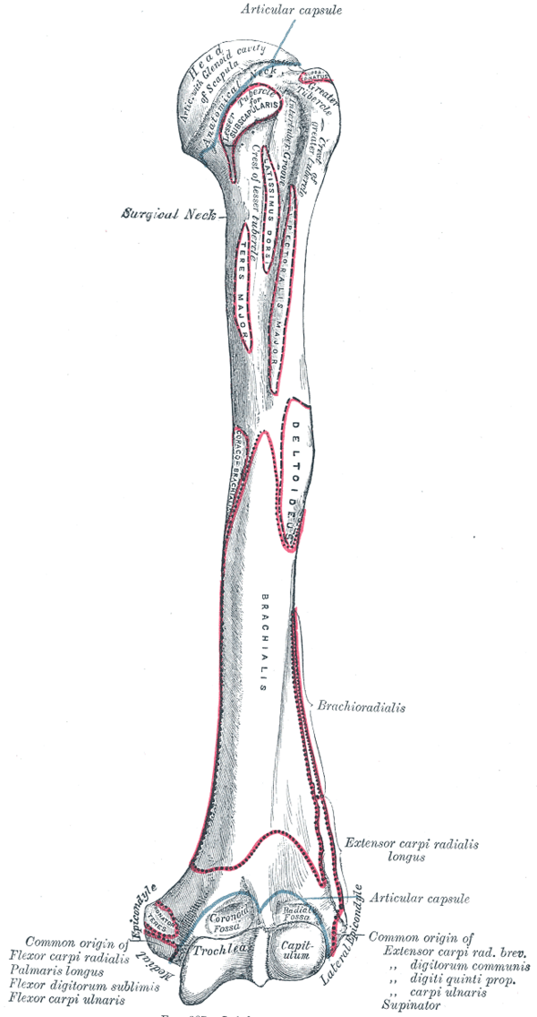 Плечевая мышца (лат. musculus brachialis) — лежит глубже двуглавой мышцы плеча, начинается от передней поверхности плечевой кости и от обеих межмышечных перегородок (лат. septa intermuscular brachii laterale et mediale), прикрепляется к бугристости локтевой кости (лат. tuberositas ulnae).