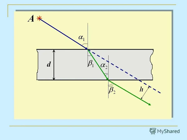 Расстояние по горизонтали между перпендикулярами, опущенными в точки падения входящего луча и выхода преломлённого луча равно:
