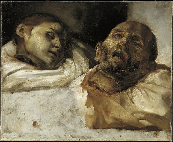 Обнажённые мертвецы на первом плане — обращение к традиционным для европейского искусства темам «Танец смерти» и «Триумф смерти» — нагота мёртвого человека трактуется как «отсутствие всех благ» и противопоставляется наготе «естественной», «божественной» и «преступной». Смерть ещё страшней, когда её никто не замечает, когда никто не оплакивает мертвецов[13]. Тела людей, проведших две недели почти без пищи и воды, должны были бы быть более измождёнными, однако художник написал прекрасных атлетов. Таким образом он достигает бо́льшей универсализации, поднимая частную драму до общечеловеческой трагедии.