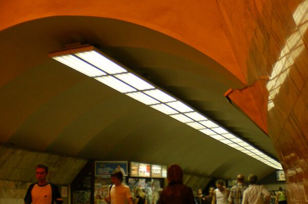 Площадка перехода, на которой находится рельефное панно «Александр Невский», освещается оригинальными светильниками, такими же, как на станции «Площадь Александра Невского-2».