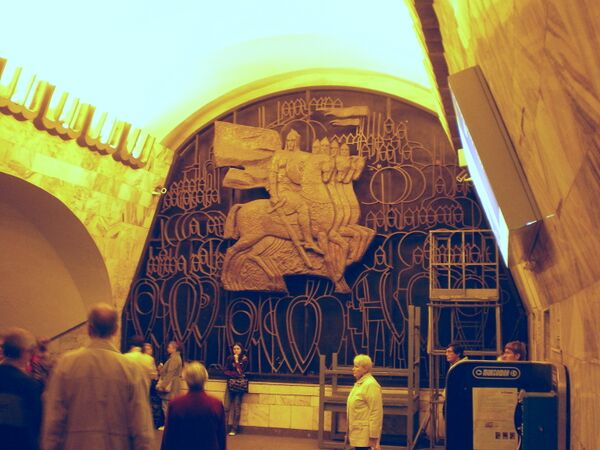 В торцевой стене подземного зала была установлена художественная композиция «Александр Невский» (скульпторы Э. Р. Озоль, И. Н. Костюхин и В. С. Новиков). Композиция выполнена из меди, на ней изображается древнерусская княжеская дружина. Панно получило прозвище «Пять мужиков на четырёх конях» по причине ошибки композиции. До 1985 года панно находилось в южном торце станции, за ней находилась кирпичная стена, закрывавшая две последние станционные двери