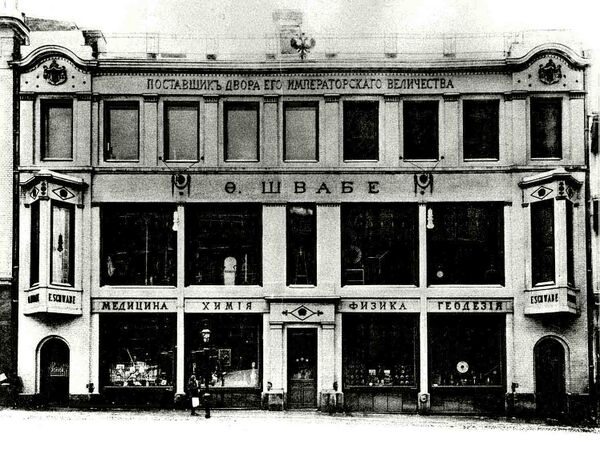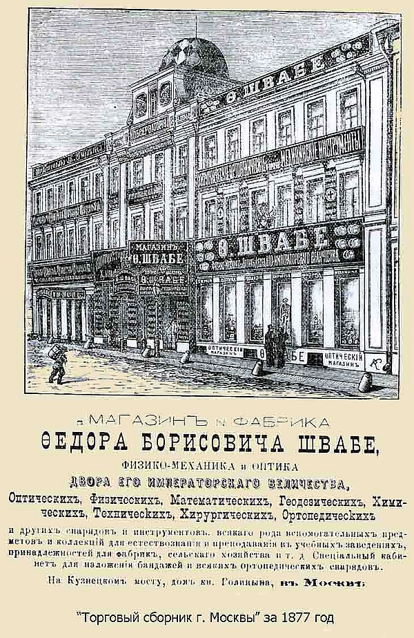 В 1850-х годах здесь открывается магазин семян и саженцев садовых и сельскохозяйственных растений ботаника и основателя известной фирмы К. А. Мейера и магазин английских металлических товаров О. И. Губерта (затем — В. Кирхгофа)[1]. В середине 1850-х в угловой дом переезжает фирма швейцарского купца Ф. Б. Швабе,[8]. В начале XX века фирма, которой после смерти А. И. Гамбургера руководила его вдова — Матильда Гамбургер — стала одним из крупнейших в России предприятий по производству оптических, физических, геодезических приборов и медицинских инструментов[15]. Магазин предлагал покупателям большой ассортимент товаров как по фотографии, так и по дагерротипии: объективы Фойхтлендера, складные штативы, копирные рамки, дагерротипные пластинки, фотографическую бумагу, французские стёкла для коллодиума. Здесь же москвичи впервые ознакомились с фонографом и другими изобретениями Томаса Эдисона. На крыше здания магазина была устроена башня с астрономической обсерваторией, где согласно расписанию в вечернее время можно было послушать лекции по астрономии, наблюдать Луну и другие планеты[8].