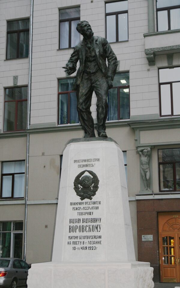 В небольшом парадном дворе, выходящим в проезд Первого Российского Страхового Общества, 11 мая 1924 года был установлен бронзовый памятник революционеру и одному из первых советских дипломатов В. В. Воровскому, сооружённый по проекту скульптора М. И. Каца (который был сотрудником полпредства СССР в Италии) и установленный на этом месте в годовщину гибели В. В. Воровского. Монумент был создан в Италии при участии НКИД, НКВД и представительства СССР за границей, о чём свидетельствует выполненная на тыльной стороне постамента надпись. Памятник выполнен в живой, подвижной манере, свидетельствующей о импрессионистических пристрастиях скульптора. Постамент памятника изготовлен из итальянского травертина[20].