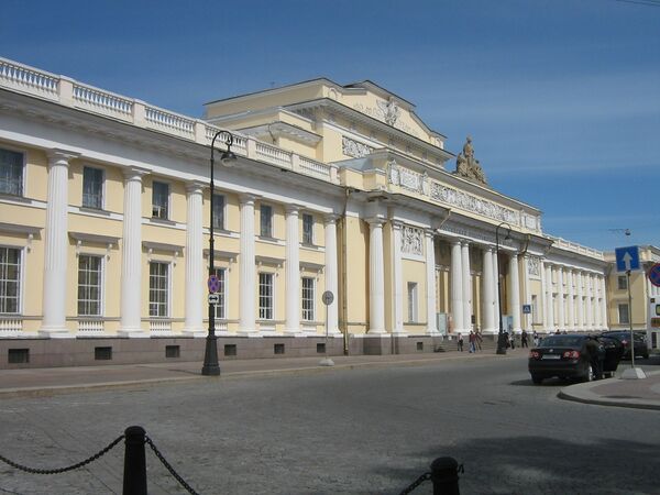 Михайловский дворец — последнее по времени постройки усадебное здание в центре Петербурга. Центральное здание дворца — основное ядро всей архитектурной композиции — размещено внутри парадного двора, отделённого от площади Искусств высокой чугунной решёткой, набранной из тяжёлых металлических копий с позолоченными наконечниками. Трое ворот украшены пилонами и военными доспехами. Дворец имеет два этажа. На высоком цоколе полуподвального этажа, несколько выдвинутого вперёд, покоится центральный портик. Здание украшено 20 полуколоннами и вертикальным скульптурным фризом из 44 барельефов (скульптор В. И. Демут-Малиновский). По сторонам центрального корпуса располагаются два двухэтажных флигеля. Для оформления фасадов дворца Росси использовал пышный коринфский ордер, а для флигелей — скромный тосканский[9][30].