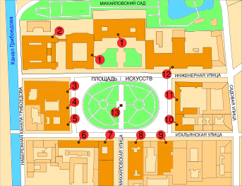 - Михайловский дворец (Инженерная улица, 4) — дворец строился в 1819—1826 годах для великого князя Михаила Павловича по проекту архитектора К. И. Росси. В 1895—1897 годах архитектором В. Ф. Свиньиным был проведён капитальный ремонт здания и его приспособление к потребностям музея. С 1898 года во дворце размещается Государственный Русский музей[29].