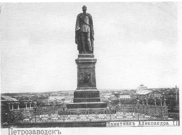 30 августа 1885 года на Соборной площади был торжественно открыт памятник императору Александру II по проекту скульптора И. Н. Шредера. Статуя была отлита из бронзы на заводе Адольфа Моранда в Санкт-Петербурге, пьедестал изготовлен из тивдийского мрамора тёмно-зелёного цвета по проекту академика архитектуры А. О. Томишко. Высота памятника 8,5 м. Император изображён в генеральском мундире с непокрытой головой, в порфире с цепью Ордена святого Андрея Первозванного. В правой руке императора — свиток с надписью «19 февраля 1861 года». На пьедестале выбита надпись — «Царю-освободителю — Олонецкое земство. 1881»[8][3]. После революции 1917 года, в 1918 году памятник императору был снесен и переплавлен.