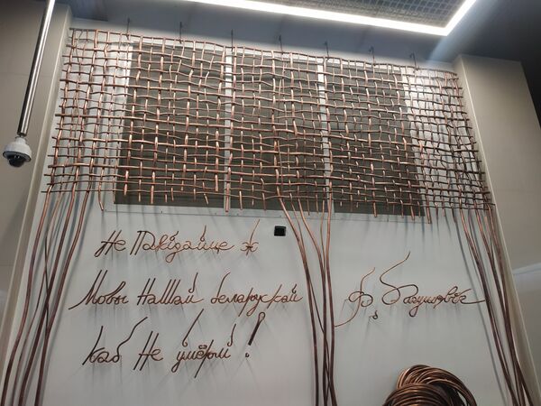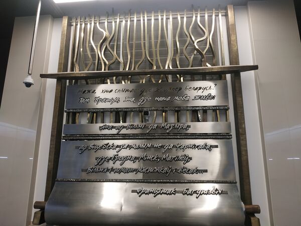 По торцам платформы на стенах установлены две скульптуры, выполненные в металле — «Ткацкий станок» работы Алексея Сорокина и Виктора Копача размером 5×6 м и «Книга белорусская» работы Максима Петруля размером 6×6 м. Обе скульптуры несут слова основоположника новой белорусской литературы Франтишка Богушевича — на первой: «Можа, хто спытае: дзё ж цяпер Беларусь? Там, братцы, яна, дзё наша мова жыве: яна ад Вільні да Мазыра, ад Віцебска за малым не да Чарнігава, дзё Гродна, Менск, Магілёў, Вільня і шмат мястэчкаў і вёсак…» (в переводе с белор. — «Может, кто спросит: где же сейчас Белоруссия? Там, братцы, она, где наш язык живёт: он от Вильно до Мозыря, от Витебска за малым до Чернигова, где Гродно, Минск, Могилёв, Вильня и много местечек и деревень...»), на второй: «Не пакідайце ж мовы нашай беларускай, каб не ўмёрлі» (в переводе с белор. — «Не утратьте же язык наш белорусский, чтобы не умерли»)[10].