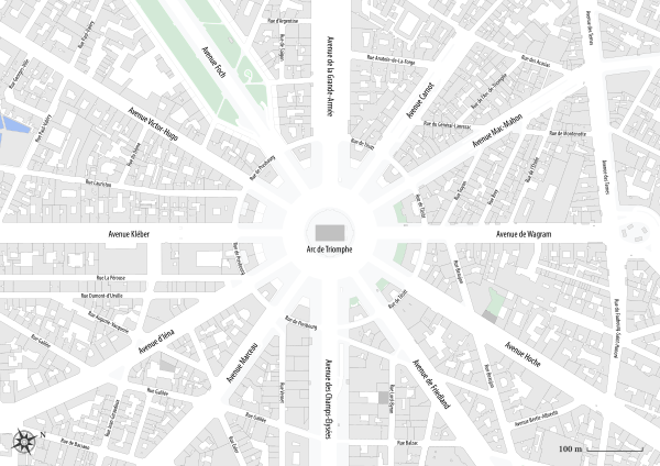 Окончательный вид площадь приобрела в 1854 году, когда по распоряжению Наполеона III к Парижу было присоединено несколько ближайших пригородов. К пяти сходившимся тут улицам, по замыслу барона Османа, префекта Парижа, было добавлено ещё семь (см. Османизация Парижа). По его архитектурному плану от площади Звезды разбегаются 12 лучей-проспектов. Самый помпезный — проспект Фош — имеет 120 метров в ширину. Все проспекты, ведущие к стоящей в центре площади Триумфальной арке, названы в честь маршалов Франции (Карно, Марсо, Ош) или в честь побед, одержанных французским оружием (авеню Фридланд, Ваграм, Йена). Наиболее известный из них — Елисейские Поля, который соединяет площадь Звезды и площадь Согласия.